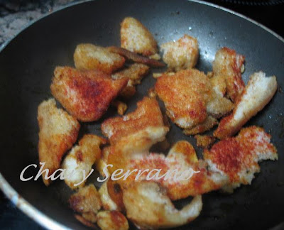 Freír el pan a rebanaditas junto con los ajos enteros, apartar y revolver con el pimentón